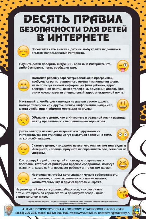 - Поощряйте Ваших детей сообщать обо всем странном или отталкивающем и не слишком остро реагируйте, когда они это делают (из-за опасения потерять доступ к Интернету дети не говорят родителям о проблемах, а также могут начать использовать Интернет вне дома и школы).